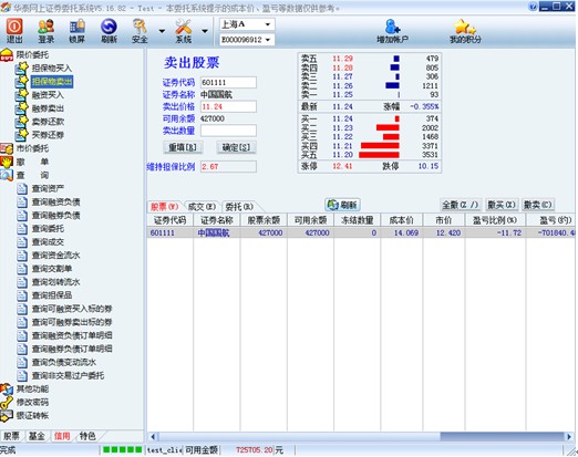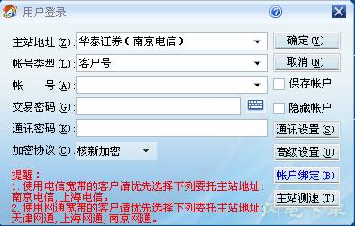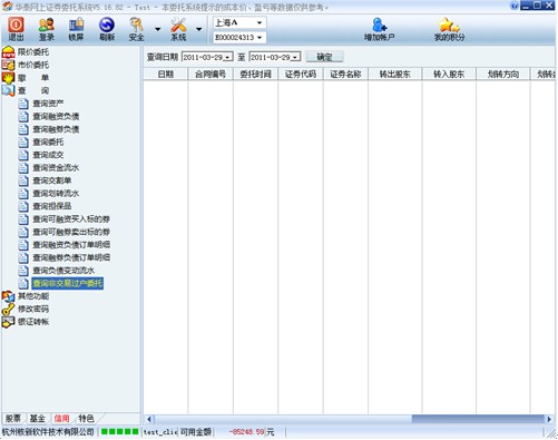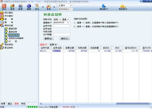选择主站地址,信用交易和普通交易的资金账户同属于一个客户号,如果用户要同时使用信用交易和普通交易,必须使用客户号进行登录。输入交易密码、通讯密码,确定。默认登录到普通股票账户,如果用户具有信用交易权限,则委托下单的左下角功能区显示 “股票”、“基金”、“信用交易”标签,“股票”、“基金”栏为普通账户的交易数据,“信用”栏为信用账户的交易数据,点击“信用交易”标签切换到融资融券交易,进入信用交易功能界面。