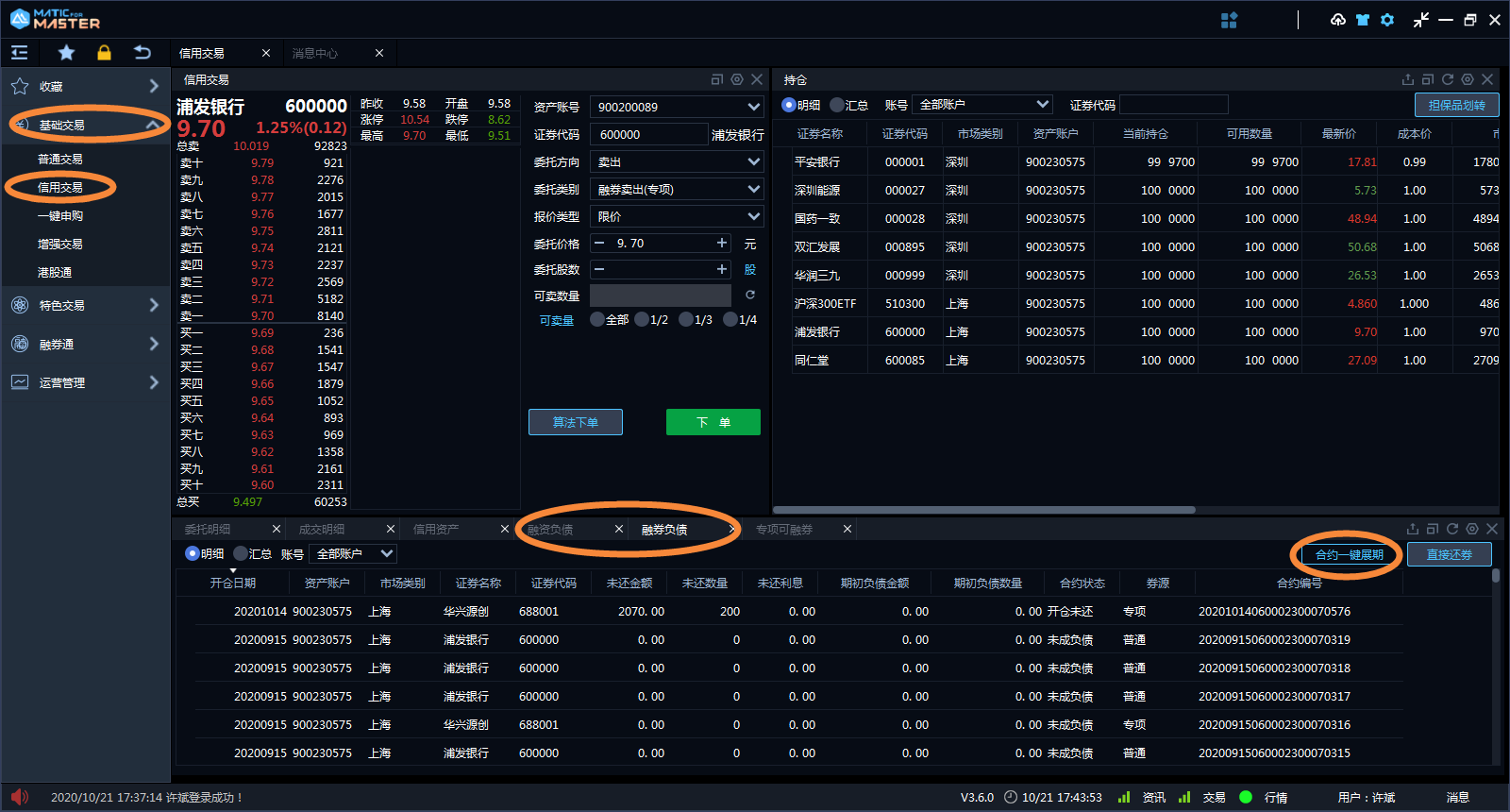 点击“基础交易-信用交易-融资负债/融券负债”菜单,点击“合约一键展期”按钮,对融资合约、券源为“专项”的融券合约申请展期。
